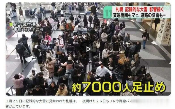 1月25号到26号,北海道突然下起大雪,新千岁机场一下被堵得死死的,中国网友拍的视频里,候机厅满是人,有的躺在行李箱上闭眼歇着,有人跑了四趟便利店,最后只抢到几包泡面,一个滞留的中国游客说,等了五个小时才弄到个临时床位,连罗森的货架都空了。